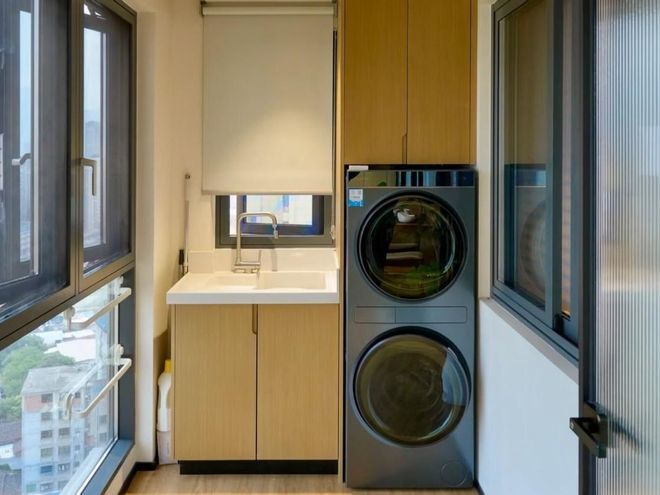 装修时,把传统的晾衣阳台改造成了多功能的功能阳台。阳台窗是使用的断桥铝系统窗,地面铺的是瓷砖,墙面做了防水,还安装了柜子和洞洞板,预留了上下水和电源,安装了电动的升降晾衣架。