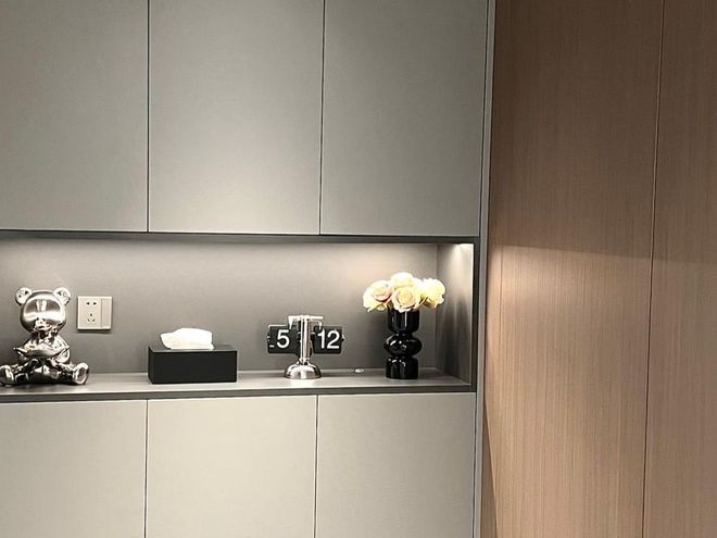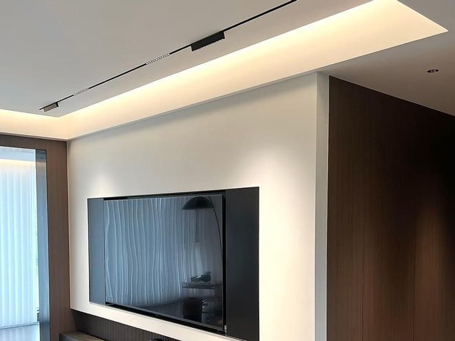 装修时,我是请了专业的灯光设计师,进行了全屋的灯光设计,采取的是无主灯,搭配磁吸轨道灯,防眩光筒灯,以及可调角的射灯和隐藏式的灯带。