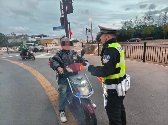 2025年11月13日9时50分,嘉定交警在曹安公路墨玉南路路口,对当事人张某某实施“驾驶拼装、加装、改装灯光装置的电瓶车上道路行驶的(首次违法)”违背法律规定的行为,处以罚款50元。